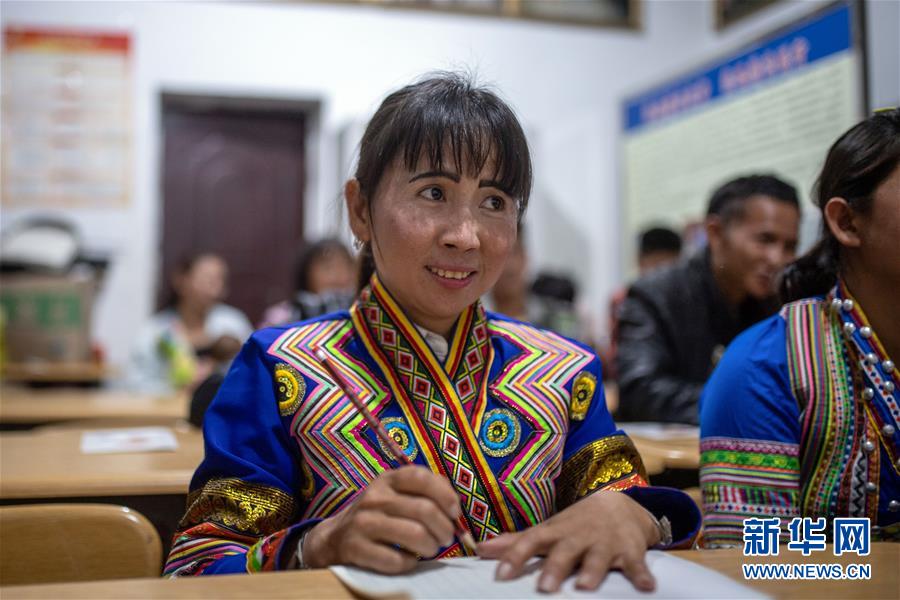4月10日,在云南省勐??h布朗山鄉(xiāng)曼囡村曼班三隊,娜四在村里上夜校。新華社記者胡超攝