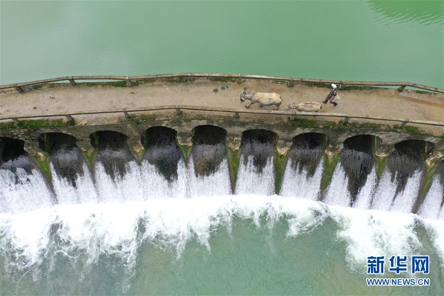 4月23日,在廣西隆安縣南圩鎮(zhèn),農(nóng)人趕著牲畜走過一座小橋(無人機(jī)照片)。新華社記者周華攝