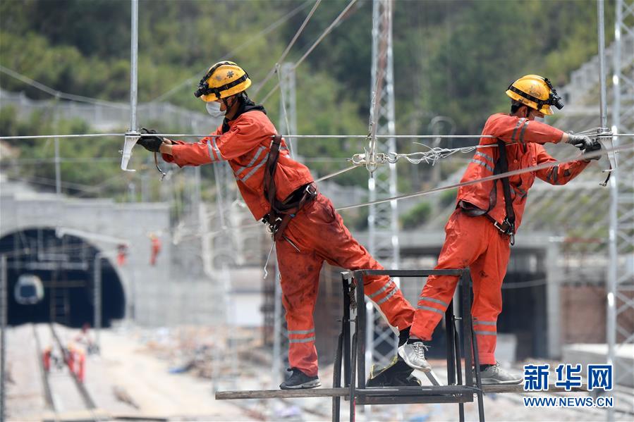 4月25日,在福建省寧德市屏南車站,施工人員開展接觸網(wǎng)調(diào)整作業(yè)。中鐵電氣化局集團(tuán)上海公司推動(dòng)衢寧鐵路福建段通信工程、信號(hào)工程、電力工程、電氣化工程各環(huán)節(jié)協(xié)同復(fù)工復(fù)產(chǎn),目前來自河北、河南、四川等國(guó)內(nèi)10個(gè)省的900多名員工返崗就業(yè)。衢寧鐵路北起浙江省衢州市,南至福建省寧德市,全長(zhǎng)379.2公里。新華社記者彭張青攝