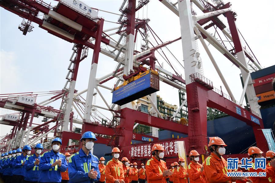 4月26日,在青島港前灣碼頭,碼頭工人參加“現(xiàn)代商船阿爾赫西拉斯”輪首航儀式。當(dāng)日,載箱量可達(dá)2.4萬(wàn)標(biāo)準(zhǔn)箱的世界最大集裝箱船“現(xiàn)代商船阿爾赫西拉斯”輪從山東青島港開(kāi)啟首航,這條船的甲板面積超過(guò)2.4萬(wàn)平方米,相當(dāng)于3.5個(gè)標(biāo)準(zhǔn)足球場(chǎng)大小。新華社記者李紫恒攝