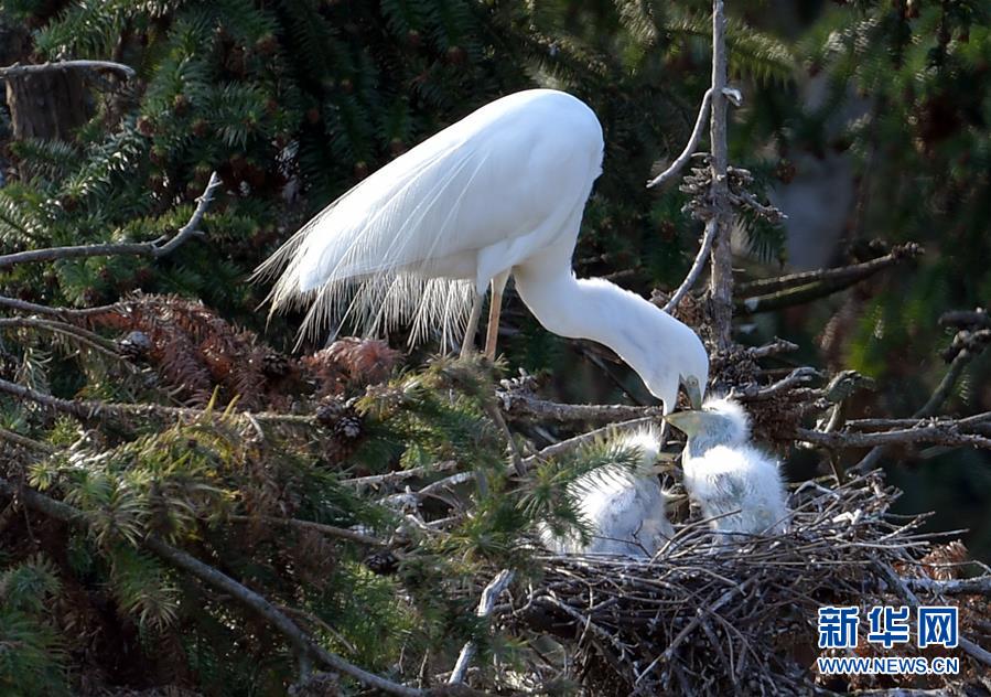 在象山森林公園,白鷺和幼鳥(niǎo)在一起(4月26日攝)。近日,在江西省南昌市新建區(qū)象山森林公園內(nèi),已安家筑巢的大批鷺鳥(niǎo)正陸續(xù)孵化后代,一派生機(jī)勃勃的景象。新華社記者彭昭之?dāng)z