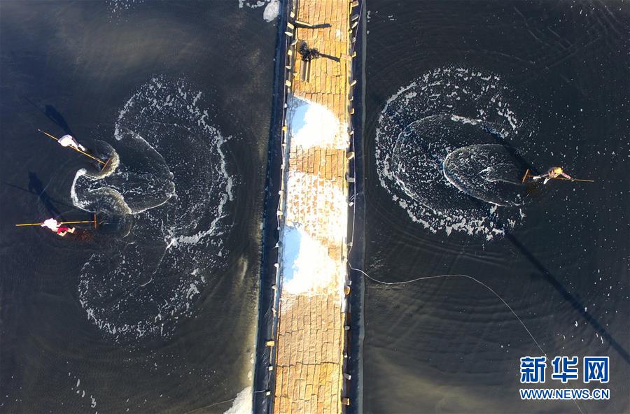 4月27日,莆田鹽場的工人在曬鹽池里忙碌(無人機照片)。莆田鹽場位于福建省莆田市秀嶼區(qū)東嶠鎮(zhèn),辛勤勞作的鹽工、縱橫交錯的曬鹽池,共同構(gòu)成如畫的風(fēng)景。新華社記者魏培全攝