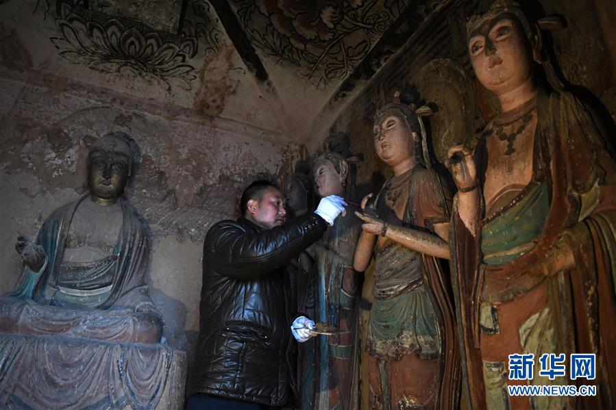 12月25日,在麥積山石窟第11窟,修復(fù)師牟常有對塑像破損處進(jìn)行加固處理。