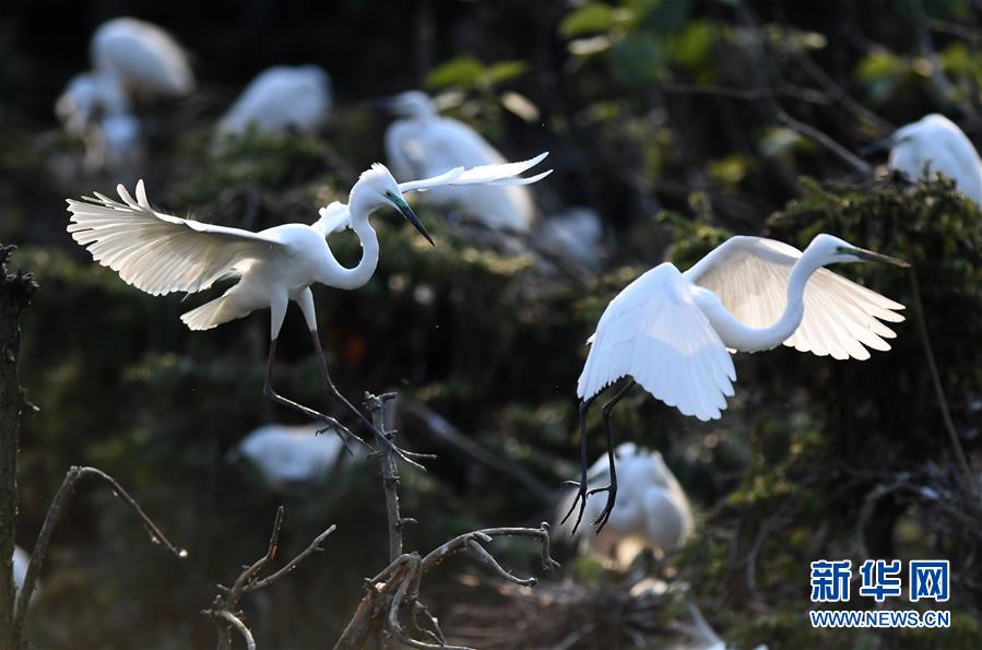 白鷺在位于鄱陽湖畔的南昌市象山森林公園內(nèi)棲息(4月27日攝)。近日,在江西省南昌市新建區(qū)象山森林公園內(nèi),已安家筑巢的大批白鷺進(jìn)入繁殖旺季。在夕陽的照耀下,白鷺時(shí)而翩翩起舞,時(shí)而展翅盤旋,構(gòu)成一幅美麗的自然生態(tài)畫卷。新華社記者萬象攝