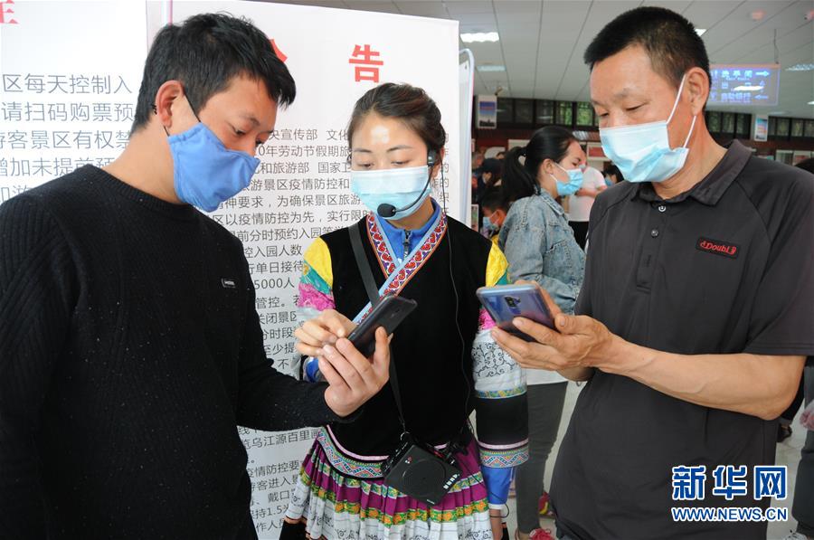 4月30日,織金洞景區(qū)工作人員(中)在給游客講解線上購票方法。“五一”小長假將至,位于貴州省織金縣的世界地質(zhì)公園織金洞景區(qū)迎來各地游客。據(jù)了解,該景區(qū)實行分時段預約和人數(shù)限流措施,確保游客安全有序游覽。新華社記者 李黔渝 攝