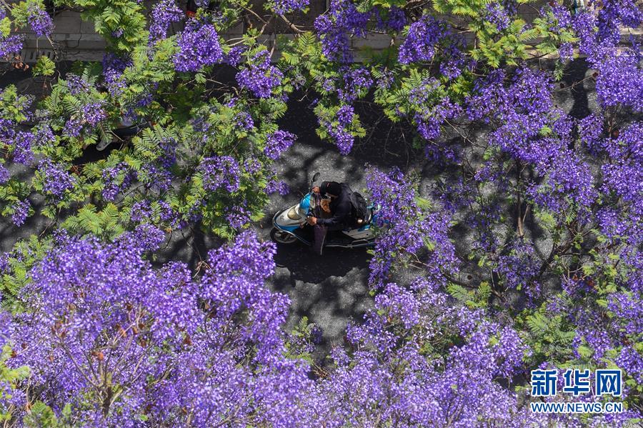 這是5月2日在昆明市桃源街拍攝的藍(lán)花楹。近日,云南省昆明市部分街區(qū)的藍(lán)花楹競(jìng)相開放,為春城增添靚麗風(fēng)景。新華社記者藺以光攝