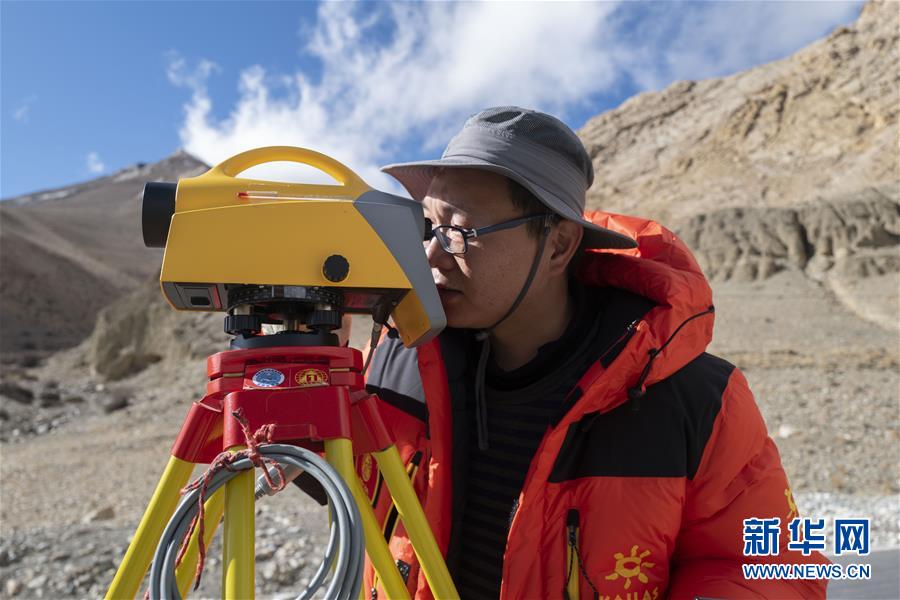 國測一大隊(duì)隊(duì)員楊明在西藏定日縣曲當(dāng)鄉(xiāng)境內(nèi)進(jìn)行水準(zhǔn)測量(5月4日攝)。水準(zhǔn)測量是一種利用提供水平視線的儀器(如水準(zhǔn)儀、水準(zhǔn)標(biāo)尺),測定地面不同點(diǎn)之間的高差,并以此推算高度的一種方法,是經(jīng)典大地測量的重要技術(shù)之一。在目前正在進(jìn)行的2020珠峰高程測量中,部分國測一大隊(duì)隊(duì)員承擔(dān)了水準(zhǔn)測量的任務(wù)。新華社記者普布扎西攝