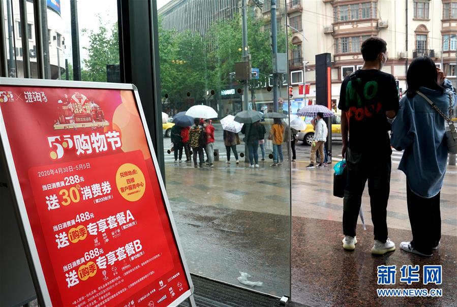 上?;春B芬患疑虉霾贾玫摹拔逦遒徫锕?jié)”活動信息(5月5日攝)。5月4日晚,上海首次啟動大規(guī)模商業(yè)促銷活動“五五購物節(jié)”,多家在線新經(jīng)濟企業(yè)參與,通過線上流量優(yōu)勢反哺線下賣場,實現(xiàn)電商與實體零售融合互動,激活消費潛力、驅(qū)動消費復(fù)蘇。據(jù)“上海發(fā)布”的消息,截至5日14時12分,“五五購物節(jié)”上海地區(qū)消費支付總額已超100億元。新華社記者劉穎攝