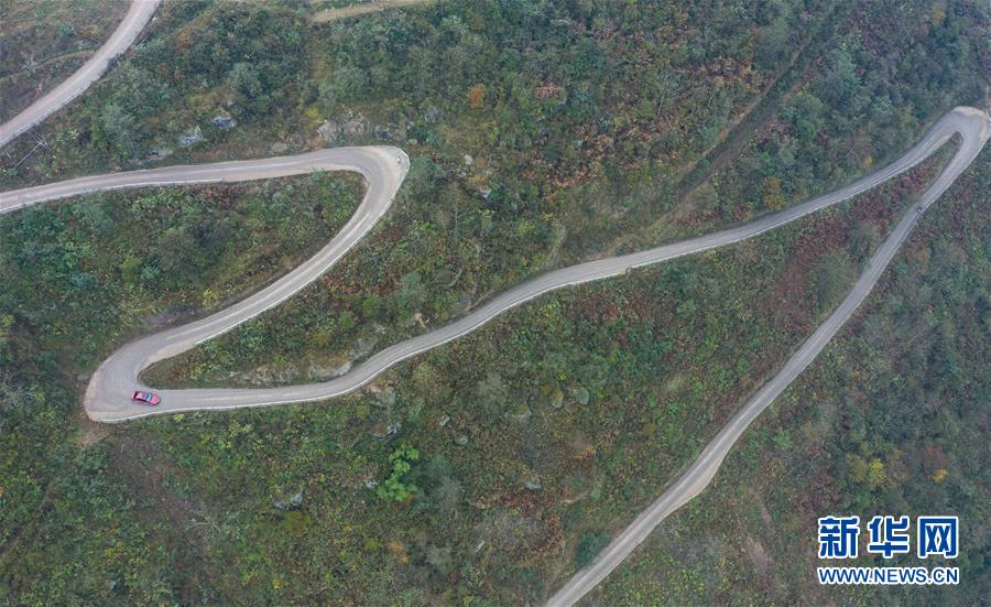 曾柱銘開著自己的小轎車行進在雷波縣箐口鄉(xiāng)厥箕村的山道上(2019年12月12日攝,無人機照片)。新華社記者江宏景攝