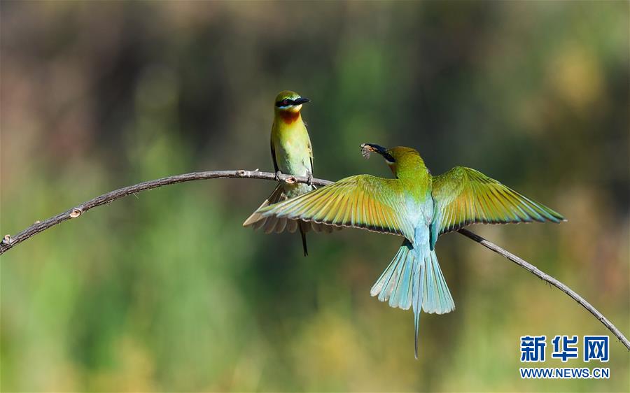 在??谖逶春酉掠畏浠⒈Wo(hù)小區(qū),栗喉蜂虎在嬉戲(5月7日攝)。新華社記者楊冠宇攝