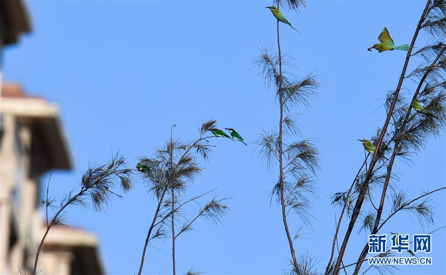 5月8日,在海口五源河下游蜂虎保護小區(qū),栗喉蜂虎和藍喉蜂虎在樹枝上休息。新華社記者楊冠宇攝
