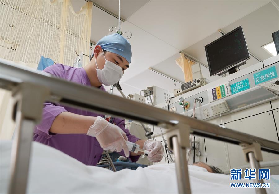 5月10日,在上海市普陀區(qū)中心醫(yī)院急診重癥監(jiān)護(hù)室內(nèi),23歲的護(hù)士范磊磊為患者進(jìn)行鼻飼。男護(hù)士團(tuán)隊(duì)中的絕大多數(shù)護(hù)士是“90后”。