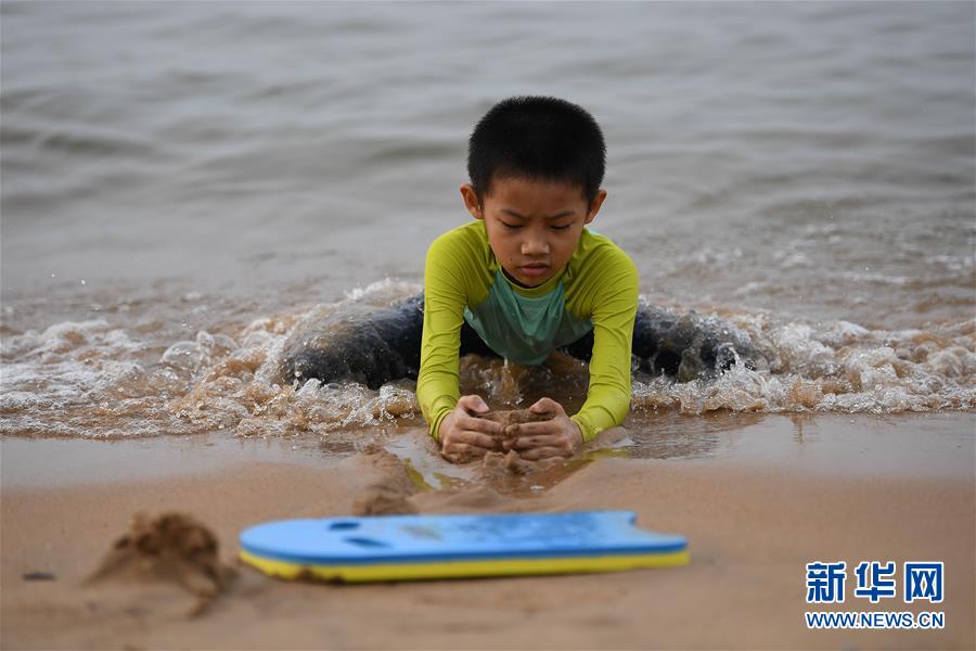 5月10日,小朋友在海口西秀海灘玩耍。近日,??诔掷m(xù)高溫,不少市民前往海灘戲水消暑。新華社記者蒲曉旭攝
