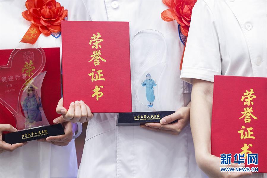 5月11日,獲獎(jiǎng)護(hù)士在護(hù)士節(jié)活動(dòng)上手捧獎(jiǎng)杯和證書。在國(guó)際護(hù)士節(jié)到來(lái)之際,北京大學(xué)人民醫(yī)院11日舉辦慶祝護(hù)士節(jié)暨優(yōu)秀集體和個(gè)人表彰活動(dòng),并邀請(qǐng)?jiān)踽t(yī)療隊(duì)護(hù)士代表分享戰(zhàn)“疫”故事。我國(guó)今年護(hù)士節(jié)的主題為“致敬護(hù)士隊(duì)伍,攜手戰(zhàn)勝疫情”。新華社記者張玉薇攝