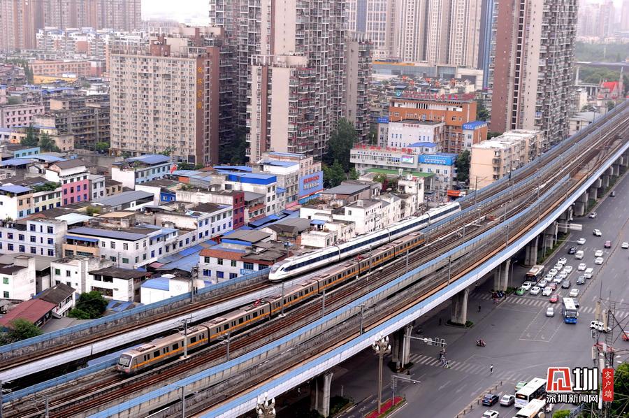 2020年5月11日,四川省成都市,犀浦站是全國(guó)首個(gè)鐵路與地鐵換乘車站。圖為動(dòng)車、地鐵同時(shí)運(yùn)行在線路上。