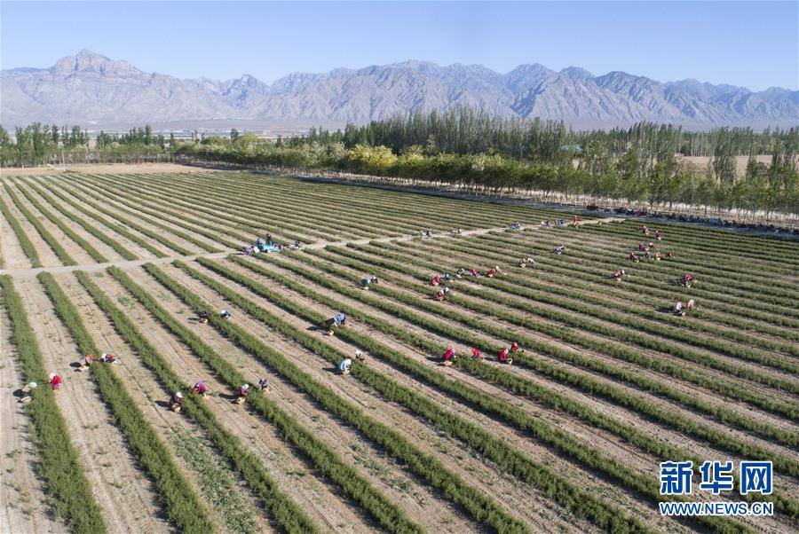 5月11日,采茶工在寧夏百瑞源賀蘭山基地采摘枸杞芽茶(無人機(jī)照片)。當(dāng)日,寧夏百瑞源賀蘭山基地枸杞芽茶全面進(jìn)入采摘季。據(jù)了解,該基地茶園面積300余畝,助力附近200多名農(nóng)民就業(yè)增收。新華社記者楊植森攝