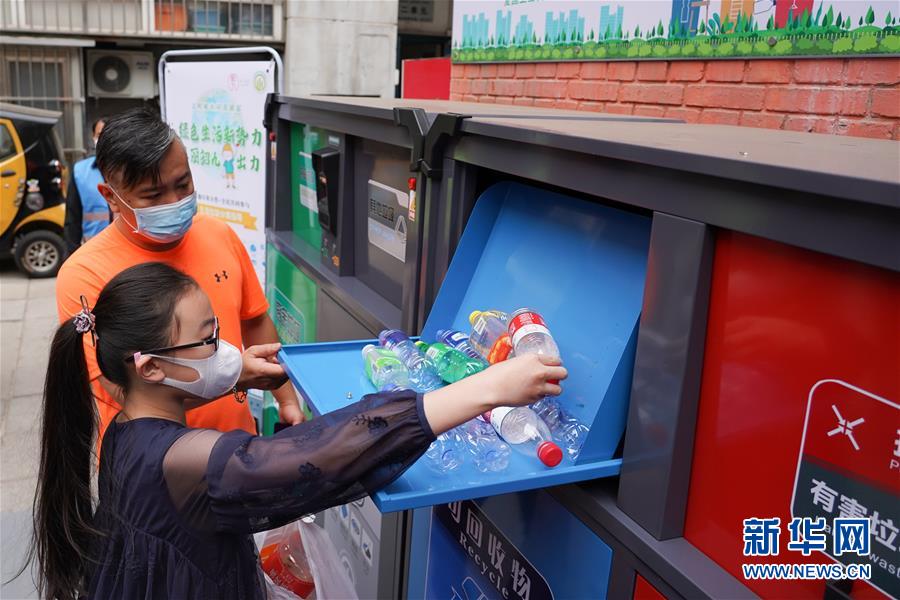 5月17日,在東華門街道韶九社區(qū),小朋友將塑料瓶投放到四分類智能垃圾桶內(nèi)。新華社記者鞠煥宗攝