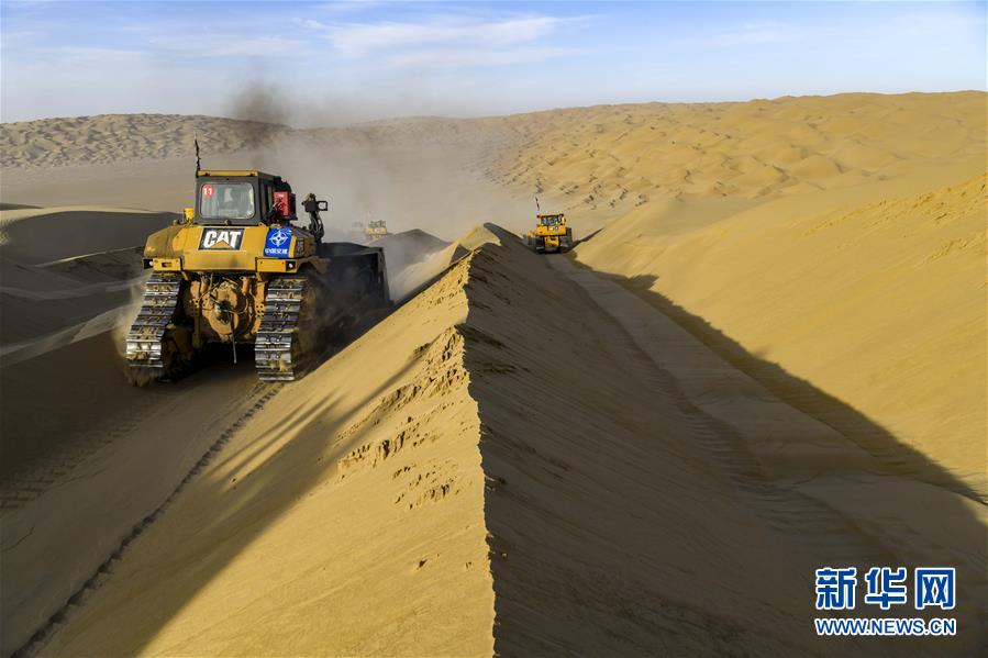 在新疆尉犁至且末沙漠公路施工現(xiàn)場,工人駕駛大型推土機推平沙山(5月16日攝)。新華社記者胡虎虎攝