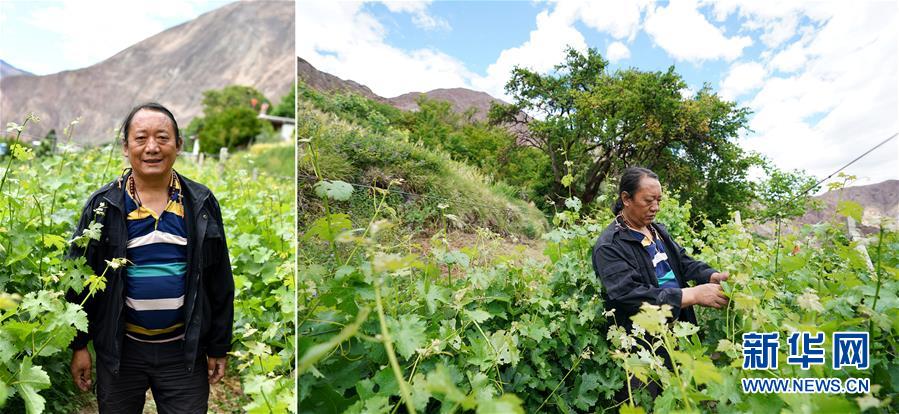 拼版照片:左圖為西藏昌都市芒康縣木許鄉(xiāng)阿東村村民楊培;右圖為楊培在葡萄園里忙碌。近年來,芒康縣大力發(fā)展葡萄種植,成為群眾脫貧增收的“甜蜜”產(chǎn)業(yè)。楊培在村里種了3.5畝葡萄,2019年出售葡萄賺了8000多元。以前,楊培只種青稞和玉米,除了自給自足,幾乎沒有經(jīng)濟收益(5月6日攝)。新華社記者詹彥攝