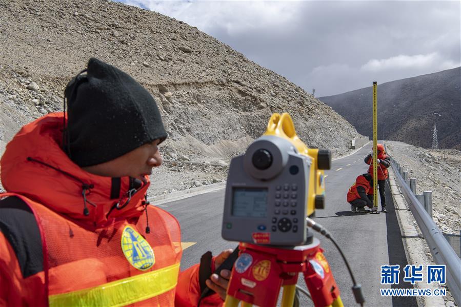 國(guó)測(cè)一大隊(duì)隊(duì)員在日喀則市定日縣曲當(dāng)鄉(xiāng)境內(nèi)進(jìn)行水準(zhǔn)測(cè)量(4月18日攝)。新華社記者孫非攝