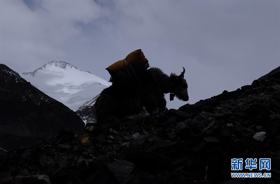牦牛運(yùn)輸隊(duì)向海拔5800米的過(guò)渡營(yíng)地運(yùn)輸物資(5月19日攝)。新華社記者晉美多吉攝