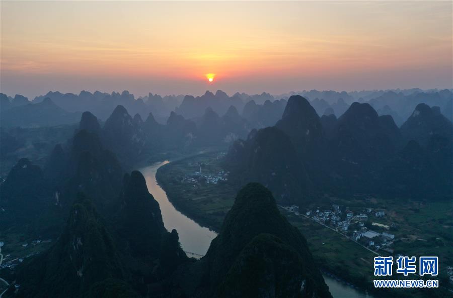 這是在廣西桂林市陽朔縣興坪鎮(zhèn)拍攝的山水風光(5月21日攝,無人機全景照片)?!吧n蒼森八桂,茲地在湘南。江作青羅帶,山如碧玉篸……”一千多年前,唐朝詩人韓愈寫盡桂林山水之美。初夏時節(jié),在廣西桂林市陽朔縣興坪鎮(zhèn),藍天白云下,煙雨朦朧中,桂林山水盡顯秀美。新華社記者周華攝
