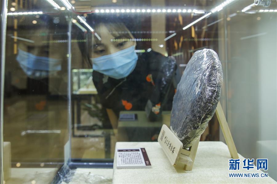 5月21日,在位于北京通惠河畔的中華古茶博物館,一名觀眾在首場(chǎng)展覽活動(dòng)——“大道遺真:館藏普洱茶專題展”上觀看一餅“號(hào)級(jí)茶”。 當(dāng)日,以“茶和世界 共品共享——茶,讓我們?cè)谝黄稹睘橹黝}的首個(gè)“國(guó)際茶日”萬(wàn)里茶道系列活動(dòng)在北京中華古茶博物館開(kāi)啟。 新華社記者 張玉薇 攝