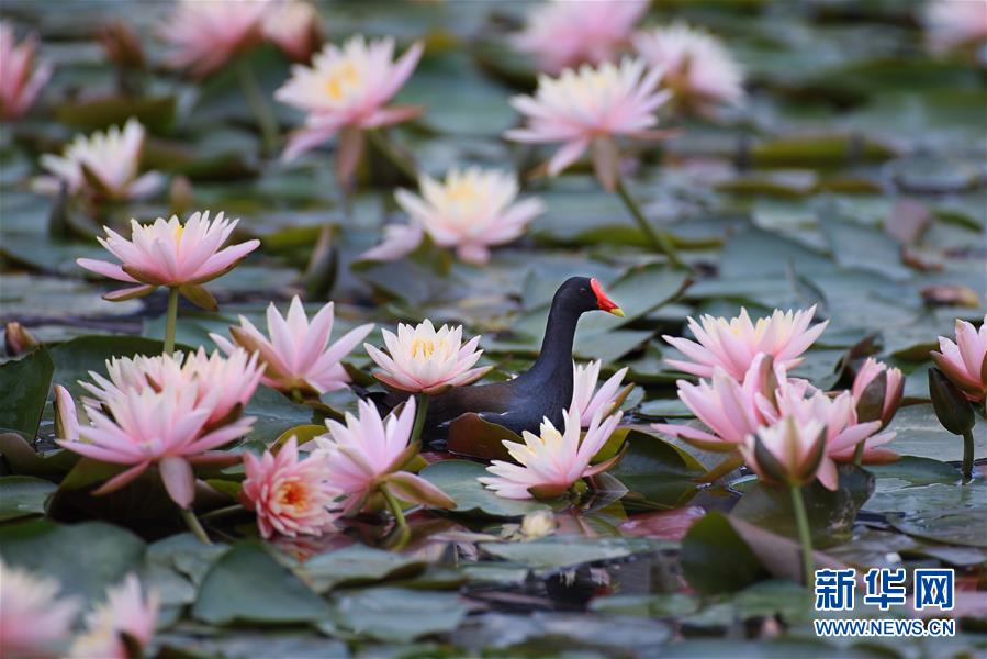 5月22日,一只紅嘴水雞在蓮葉間游弋。近日,貴陽市觀山湖公園內大片盛開的蓮花吸引了不少水鳥在其間嬉戲覓食。新華社記者劉續(xù)攝
