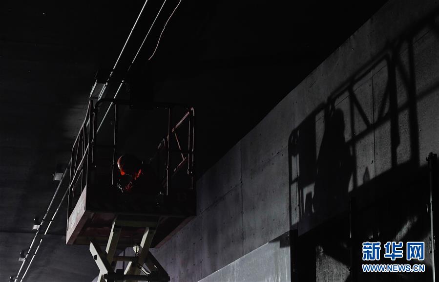5月23日,工人在??谖拿鳀|越江通道項目隧道內(nèi)安裝照明設備。新華社記者楊冠宇攝