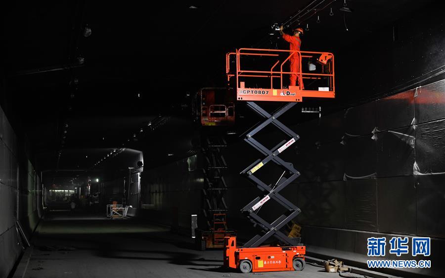 5月23日,工人在??谖拿鳀|越江通道項目隧道內安裝照明設備。新華社記者楊冠宇攝