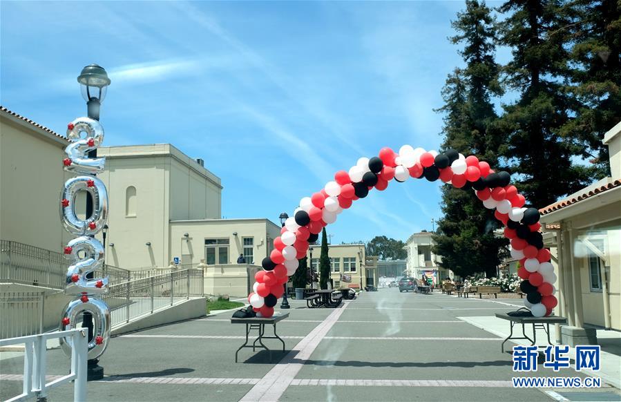 這是5月22日在美國(guó)加州北部圣馬特奧縣伯靈格姆高中拍攝的歡迎畢業(yè)生的氣球拱門。