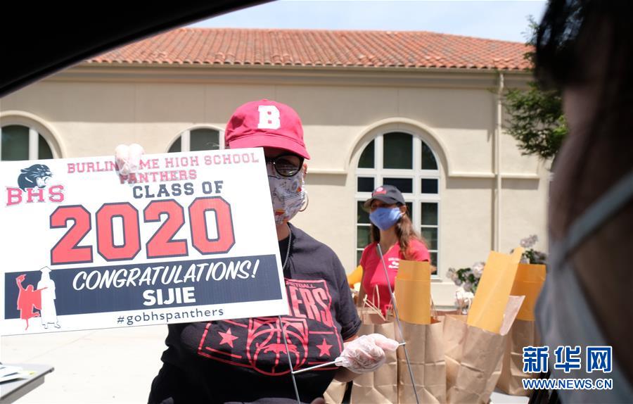 5月22日,在美國加州北部圣馬特奧縣,工作人員歡迎來辦理畢業(yè)手續(xù)的學(xué)生。新華社記者吳曉凌攝