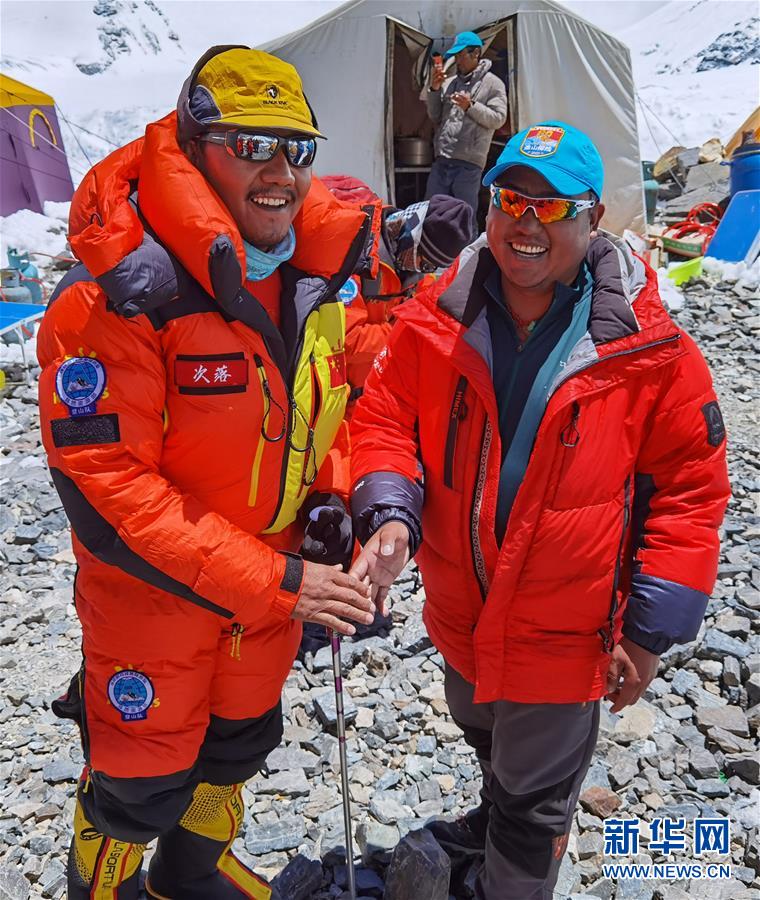 5月24日,2020珠峰高程測(cè)量登山隊(duì)副隊(duì)長(zhǎng)桑珠(右)和沖頂組組長(zhǎng)次落(左)在海拔6500米的前進(jìn)營(yíng)地。新華社特約記者拉巴攝