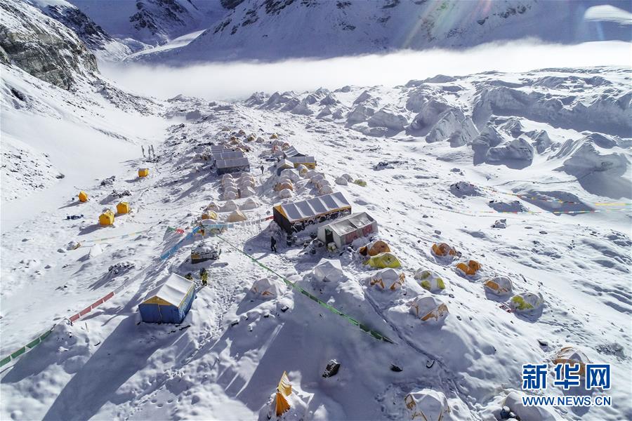 位于珠峰東絨布冰川旁海拔6500米的珠峰前進(jìn)營(yíng)地(5月22日攝,無人機(jī)照片)。新華社記者晉美多吉攝