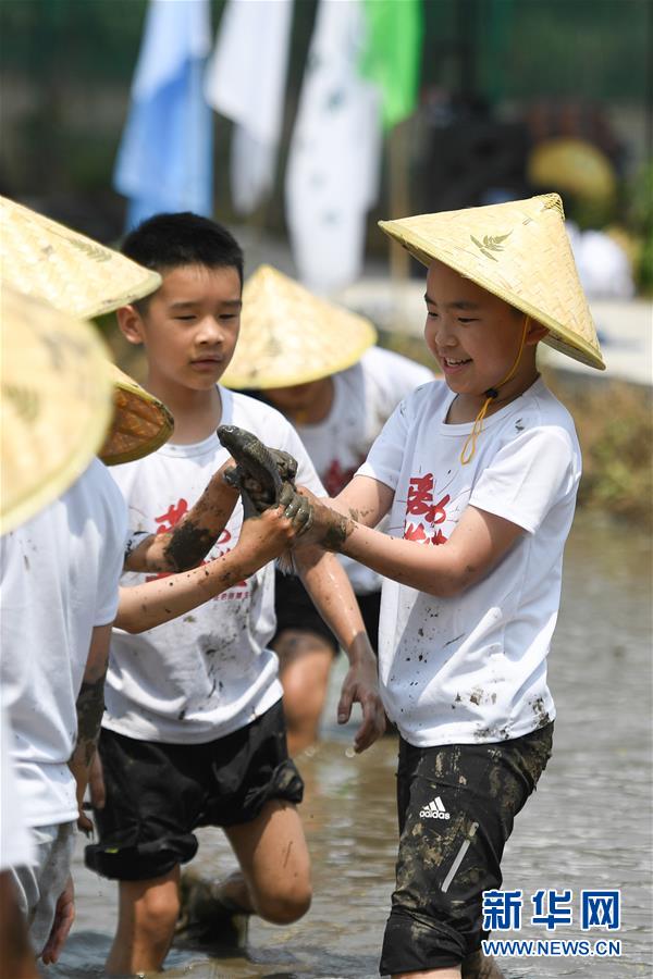 5月24日,小朋友在稻田里捉魚(yú),體驗(yàn)農(nóng)事。當(dāng)日,十余名小朋友在家長(zhǎng)的帶領(lǐng)下來(lái)到浙江省湖州市吳興區(qū)八里店鎮(zhèn)尹家圩糧油植保農(nóng)機(jī)專業(yè)合作社的稻田中,參加親子插秧、稻田捉魚(yú)等農(nóng)事體驗(yàn)活動(dòng)。新華社記者黃宗治攝