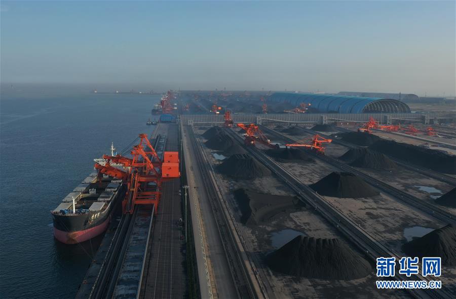 5月22日,一艘輪船靠泊在唐山港曹妃甸港區(qū)煤碼頭三期工程的先期工程泊位裝貨(無人機(jī)照片)。新華社記者楊世堯攝