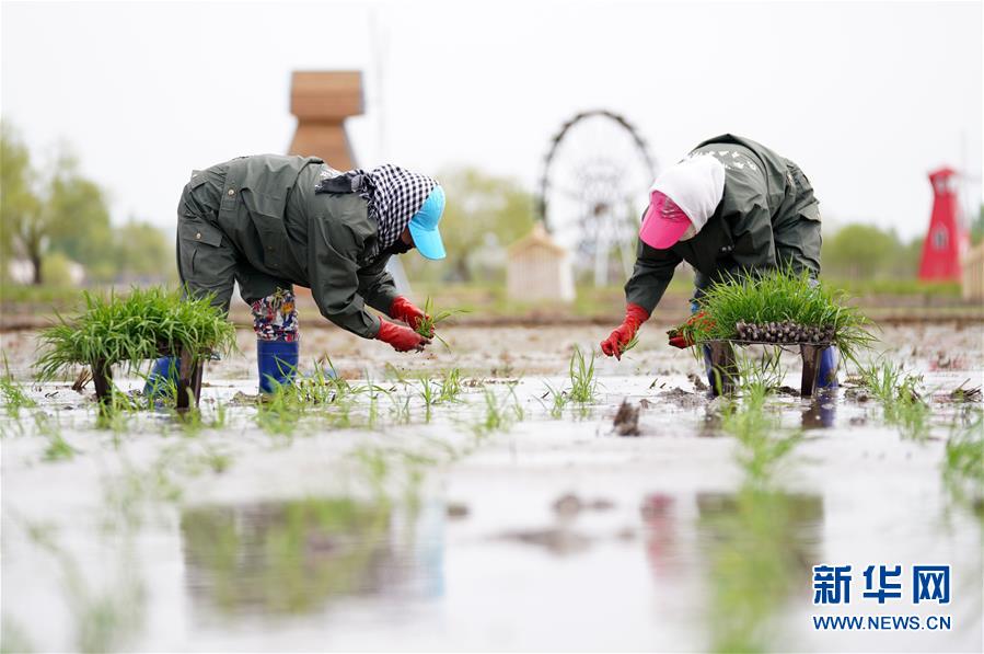 5月22日,在寧安市渤海鎮(zhèn)上官地村一塊稻田中,農民在進行插秧。新華社記者王建威攝