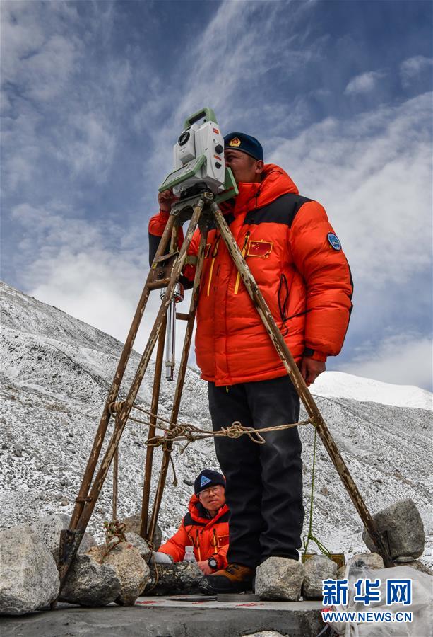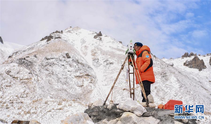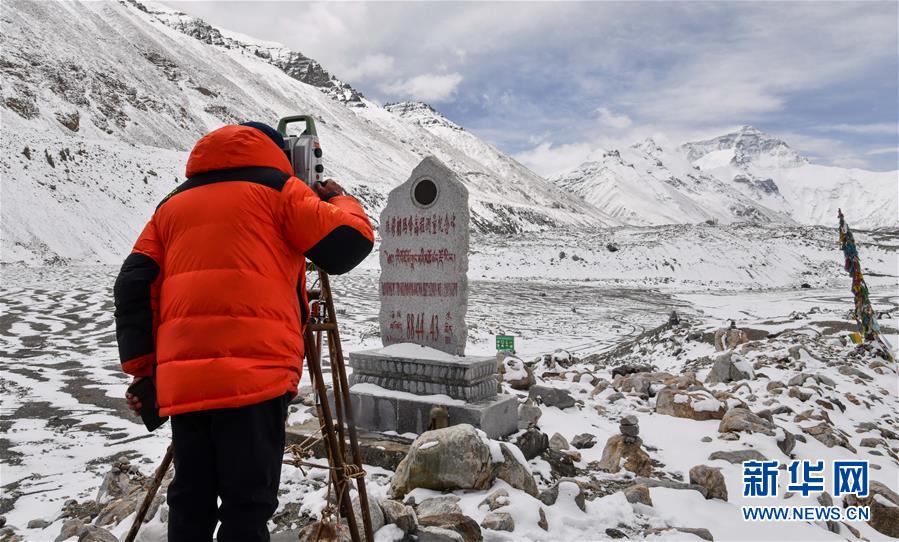 當日,2020珠峰高程測量登山隊成功登頂后,在珠峰大本營的珠峰高程起算點,自然資源部第一大地測量隊隊員利用全站儀等儀器對珠穆朗瑪峰峰頂進行交會觀測。