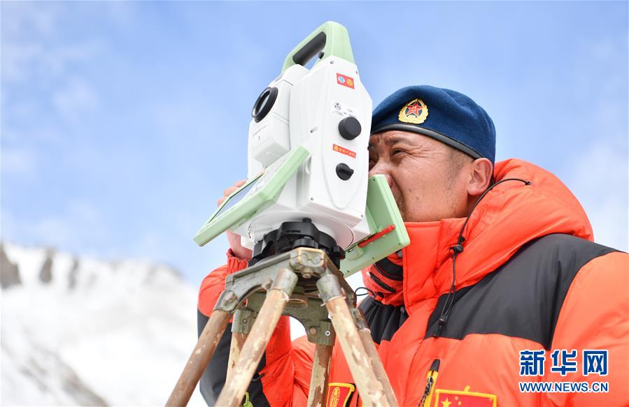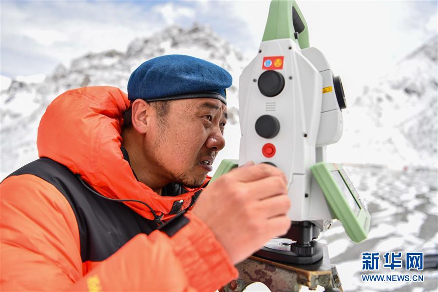 自然資源部第一大地測量隊隊員鄭林在使用全站儀對珠峰峰頂進行交會觀測(5月27日攝)。新華社記者孫非攝
