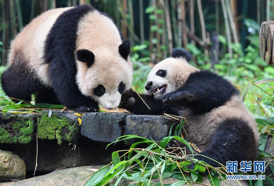 5月27日,大熊貓隆仔(左)突然出手,搶走婷仔的竹子。正在享受竹子大餐的廣州長(zhǎng)隆野生動(dòng)物世界大熊貓婷仔被大熊貓隆仔搶食,兩只大熊貓上演一場(chǎng)爭(zhēng)食戲碼。新華社記者劉大偉攝