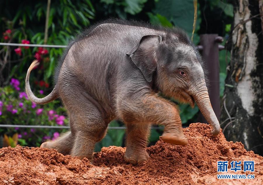 5月27日,廣州長隆的新生亞洲象寶寶在紅泥堆玩耍,這些泥土可以幫助大象護(hù)理皮膚和補(bǔ)充鹽分。新華社記者劉大偉攝
