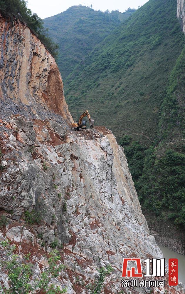 2020年5月27日,在貴州省畢節(jié)市納雍縣化作鄉(xiāng)雙巖頭村,挖掘機在觀音巖的懸崖邊修路。