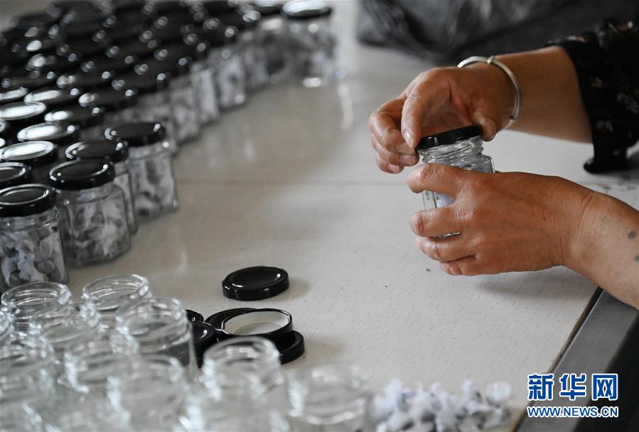 在平頂山市葉縣常村鎮(zhèn)月臺(tái)村扶貧車間,村民在包裝艾草制品(5月27日攝)。新華社記者張浩然攝