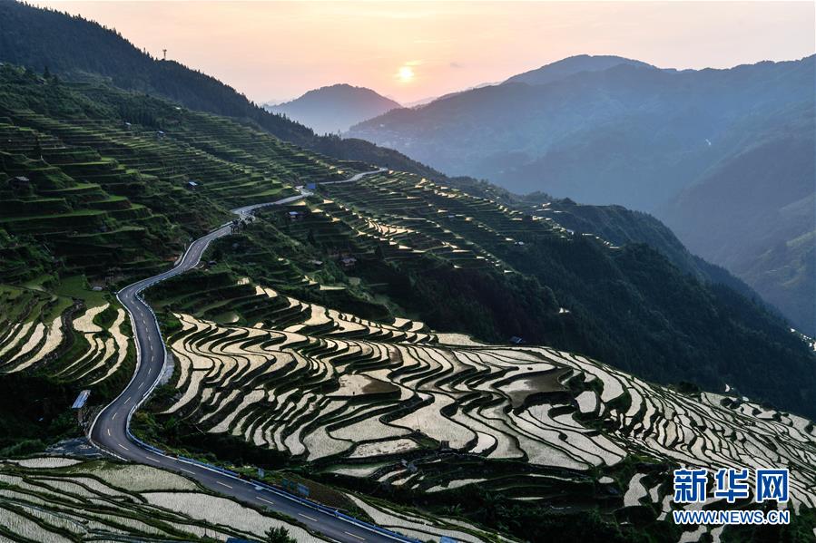 晨光中的從江縣加榜鄉(xiāng)加車梯田(5月28日攝)。夏日時(shí)節(jié),位于貴州省黔東南苗族侗族自治州從江縣加榜鄉(xiāng)加車、加頁、黨扭等苗寨的梯田在晨霧與陽光的映襯下線條分明,光影變幻,景色如畫。新華社記者 楊文斌 攝