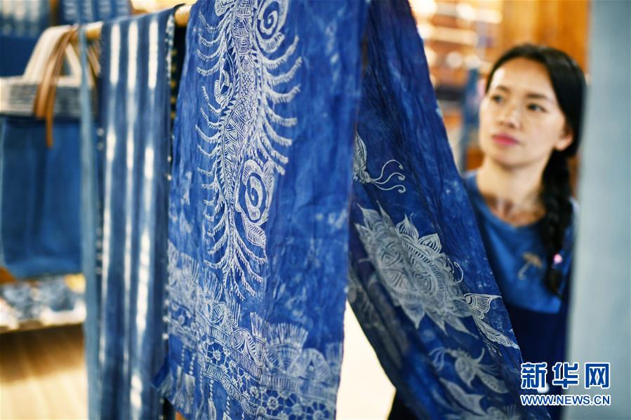 2018年,楊成蘭在村里成立傳統(tǒng)織染合作社,吸引村里及周邊村寨貧困戶入股,帶動(dòng)當(dāng)?shù)刎毨艉痛迕窦尤牒献魃纾瑥氖驴棽?、染布、藍(lán)靛種植等產(chǎn)業(yè),在傳承民族傳統(tǒng)手工技藝的同時(shí),幫助村民脫貧增收。新華社記者楊文斌攝