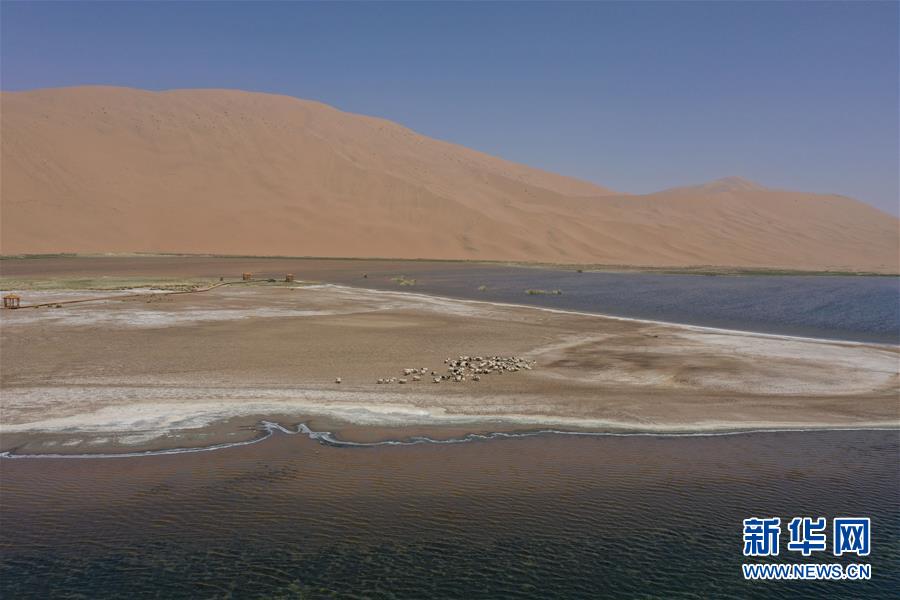 5月31日,羊群在巴丹吉林沙漠音德日?qǐng)D湖湖畔休憩(無(wú)人機(jī)照片)。新華社記者徐欽攝。