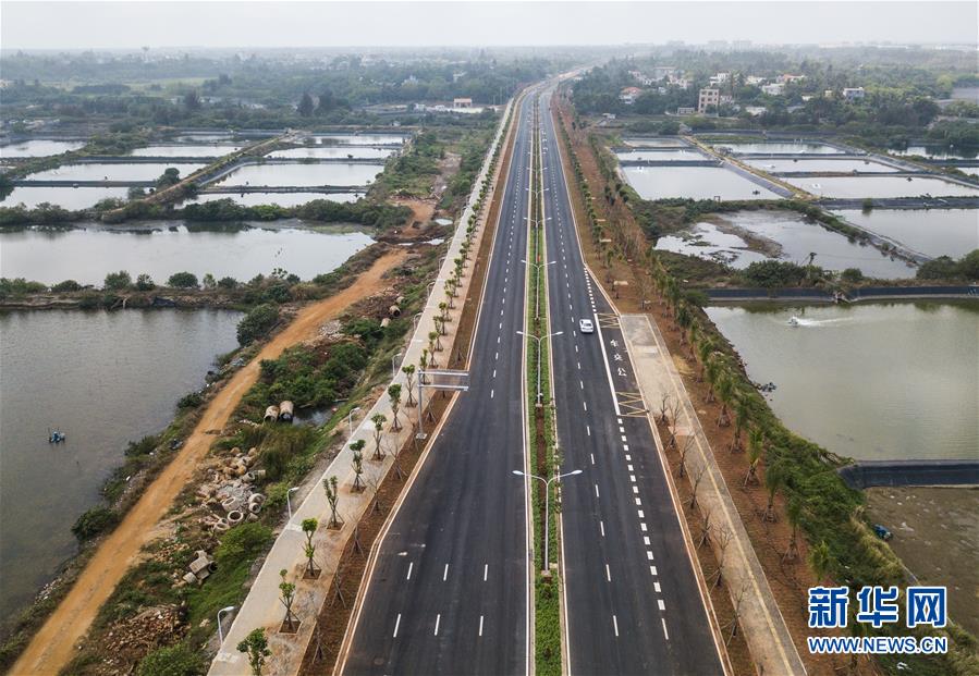 這是4月1日拍攝的位于海口江東新區(qū)的東寨港大道(無(wú)人機(jī)照片)。新華社記者蒲曉旭攝