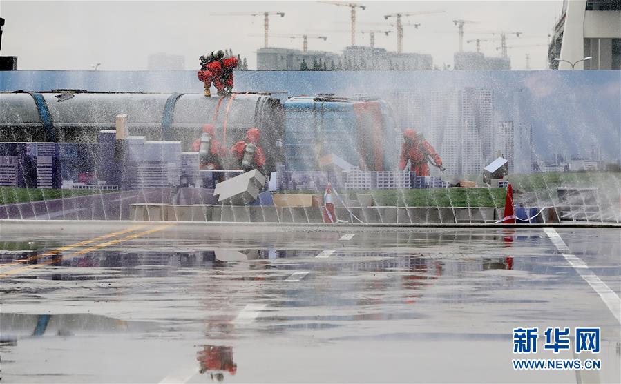 6月3日,救援人員在演練中使用水幕阻擋危化品擴(kuò)散。新華社記者方喆攝。