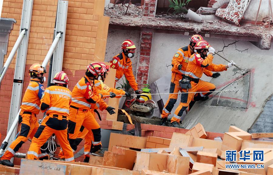 6月3日,救援人員在演練中對(duì)倒塌墻體進(jìn)行破拆。新華社記者方喆攝。