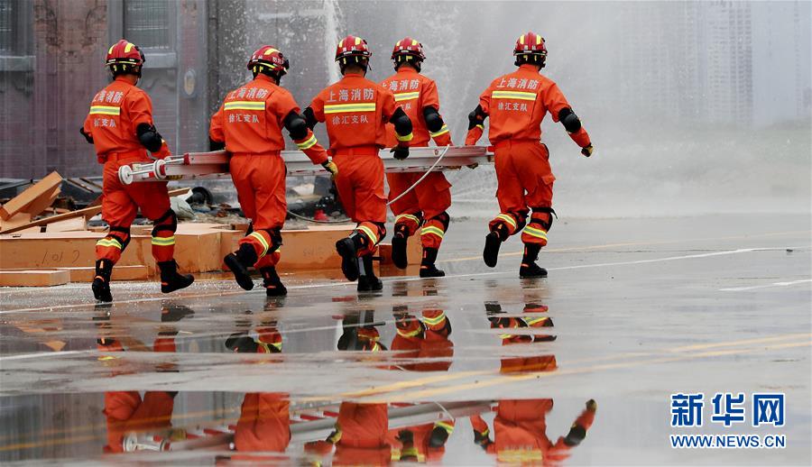6月3日,救援人員在演練中行進。新華社記者方喆攝。